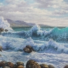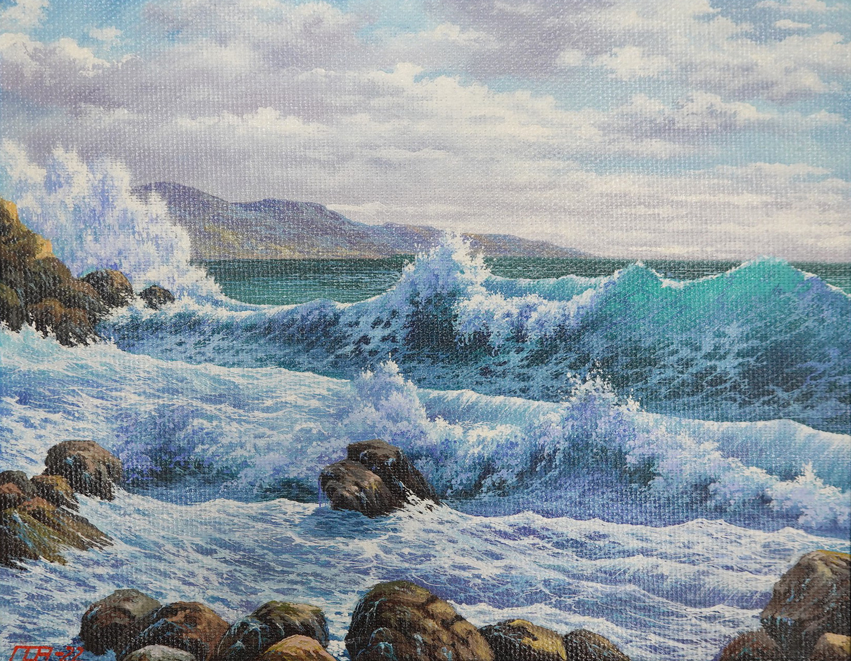 The central element of the composition is a wave rolling onto the shore. It is depicted in rich turquoise and emerald tones that catch the eye and create a feeling of depth and transparency of the water. Splashes of white foam, soaring into the air, add dynamism and liveliness to the painting. It seems that you can hear the sound of the surf and feel the salty spray on your face.