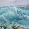 O. Podgornov’s painting is a picturesque depiction of the raging sea. The artist masterfully conveys the dynamic of the ocean wave, its power, grandeur, and endless movement, creating an effect of presence and involving the viewer in the world of the sea. At the center of the composition, a huge wave, raised by the sea wind, stretches out. Its crest, filled with light, seems to live a life of its own, leading to thoughts of the untamed power of nature. White and blue foam rolls over rapidly, creating a sense of its possible approach to the shore. The color palette of the painting masterfully conveys the atmosphere of marine freshness. The artist uses various shades of blue, turquoise, and green to convey the depth and transparency of the water. White splashes of foam add dynamism, while the gentle pinkish-golden shades of the sky create a balance between the storm of water and the calmness of the celestial expanses.