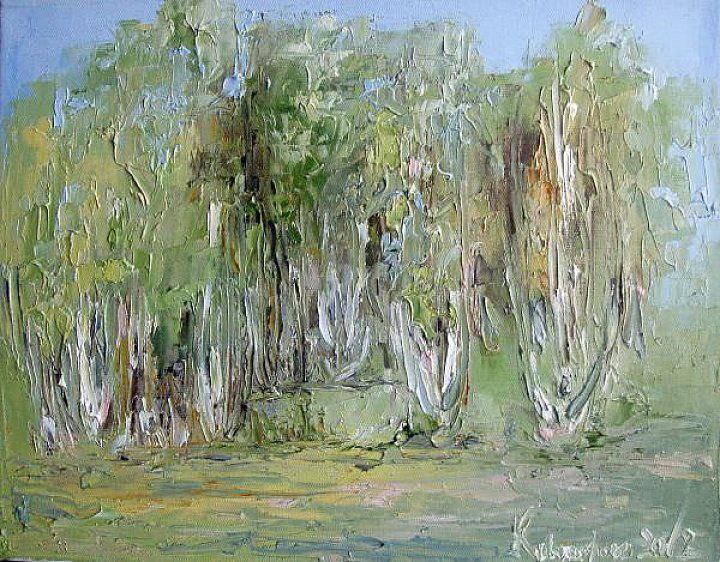 The study «Grove» by Ekaterina Kudryashova is a vivid example of an impressionistic view of nature. The artist skillfully works with thick, textured brushstrokes that literally sculpt the shape of the trees, creating the sensation of leaves trembling in the wind. The palette is filled with fresh spring shades of green, soft gray, and ochre, giving the canvas lightness and an inner vibration of light.