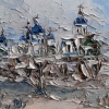 Layers of paint create a stunning play of light and shadow, conveying the majestic yet fragile appearance of the monastery. The snow-white walls of the church, painted with broad dynamic strokes, contrast with the deep blue color of the domes, which seem to float above the landscape. Thanks to the expressive technique, the building appears infused with light and the spirit of history.