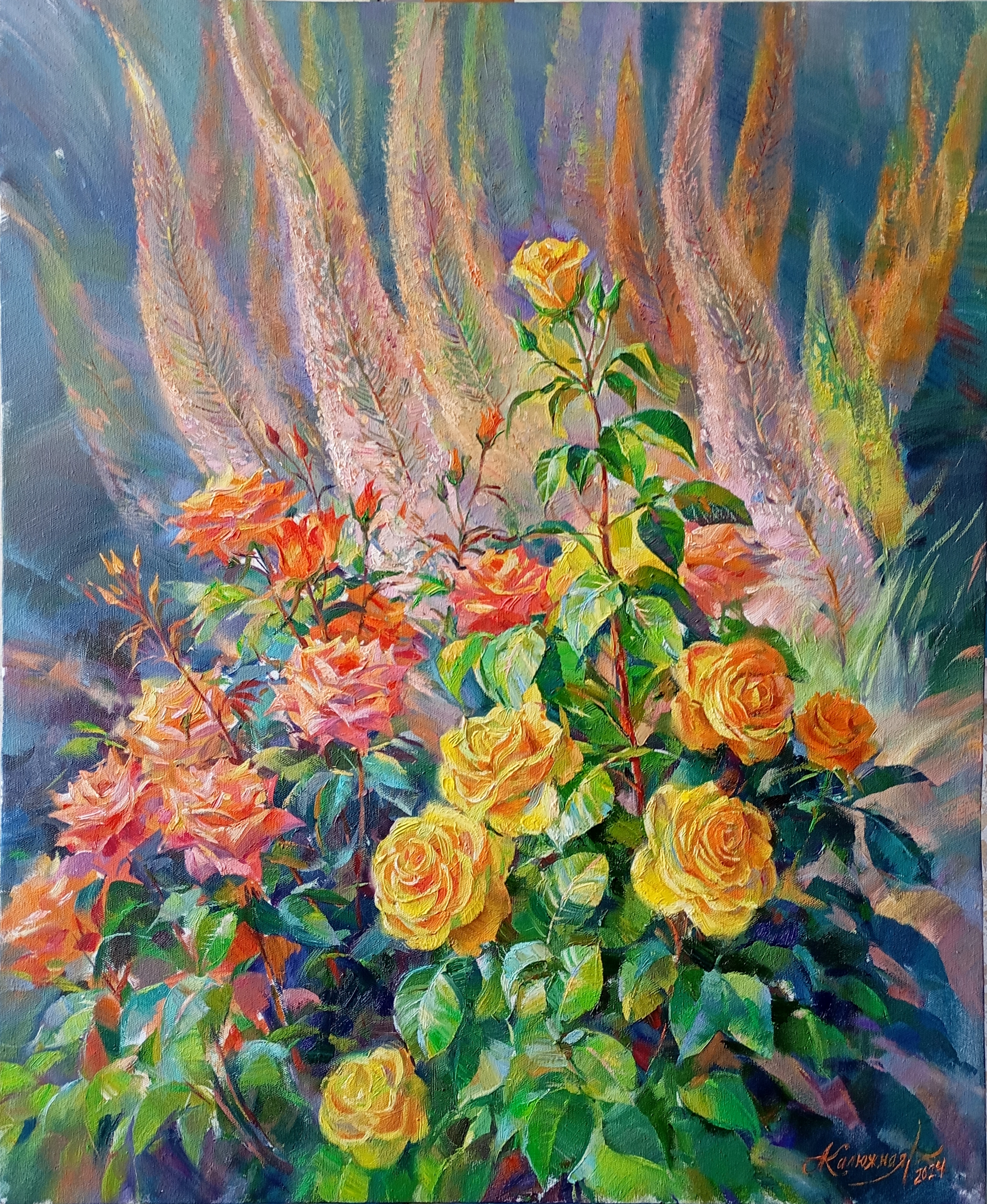The original painting "Roses with Eremurus" was painted from life in the Roerich N. Park in Crimea. Author Kalyuzhnaya A.N.