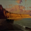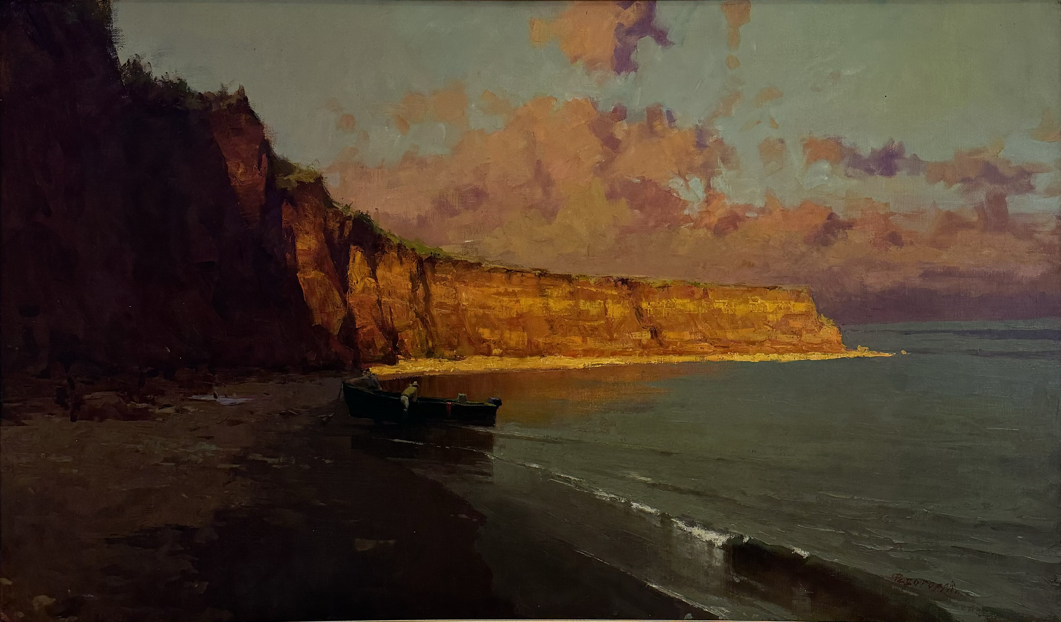 The painting depicts a coastal landscape in the rays of the setting sun. High rocky cliffs, illuminated by a warm golden light, contrast with the dark sandy shore. In the distance, the sky is painted in soft pink and purple shades, reflecting the sunset glow.