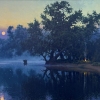 On the bank, among the dense trees, a tiny fire burns, whose light is reflected in the river, adding coziness and warmth to the picture. The dark silhouettes of spreading trees emphasize the tranquility of this place, where nature seems alive and breathing. The artist managed to convey the peaceful atmosphere of the evening, shrouded in mystical twilight and harmony.
