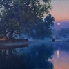 The painting conveys the mysterious and peaceful atmosphere of an evening river. Moonlight is reflected in the quiet water, creating a sense of harmony with nature. On the left bank, under a spreading tree, a fire is burning, the golden light of which softly illuminates the grass and tree trunks, adding coziness to this landscape. Smoke from the fire slowly spreads over the water, dissolving in the evening air.