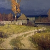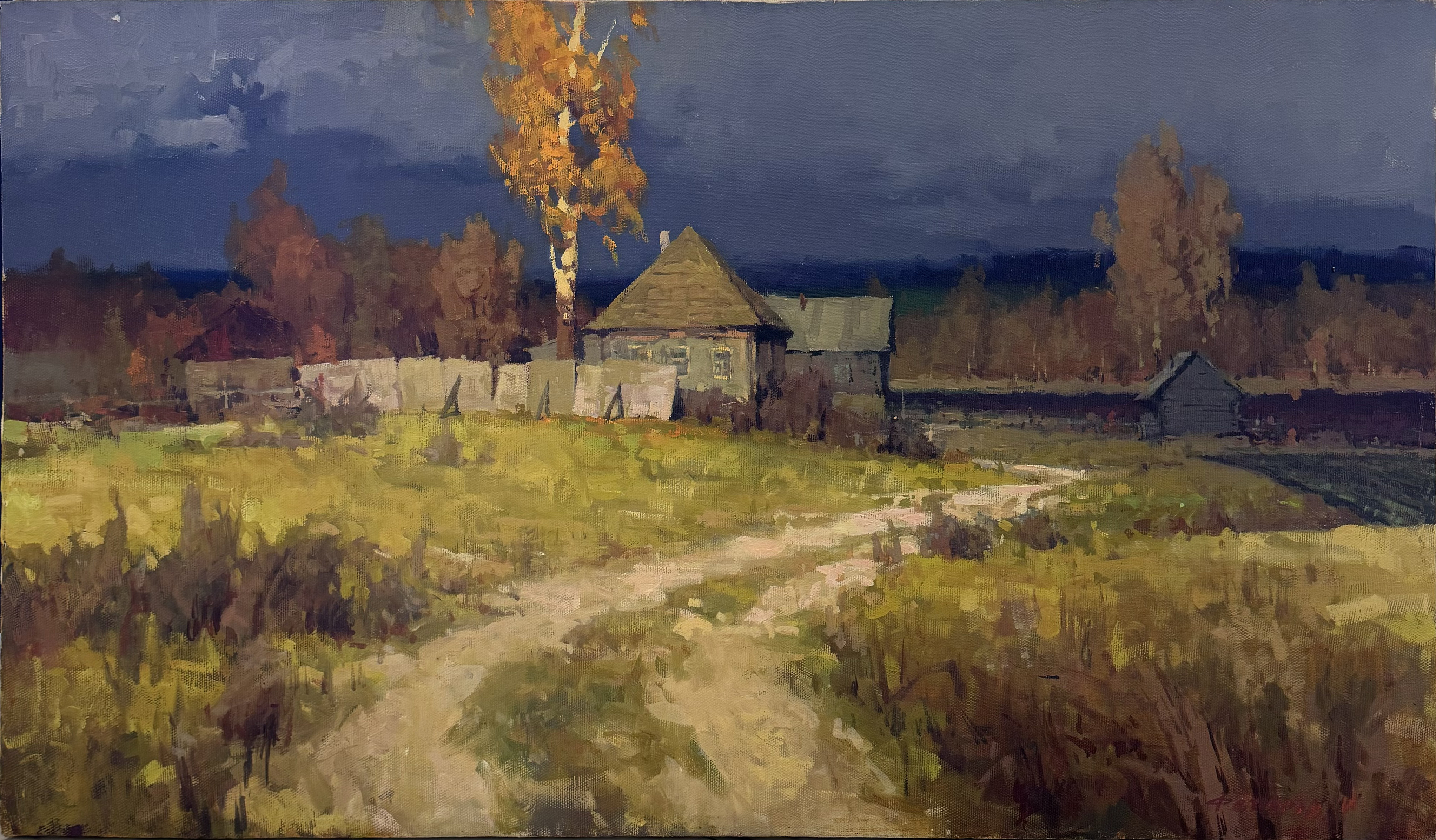 Before us is an autumn rural painting, filled with calm and slight sadness. The central place is occupied by a wooden house, surrounded by a dilapidated fence. A golden birch tree rises above it, its leaves contrasting with the heavy, stormy sky. A narrow path, winding, leads the viewer's gaze to the house, as if inviting him to plunge into the atmosphere of silence and comfort of village life.