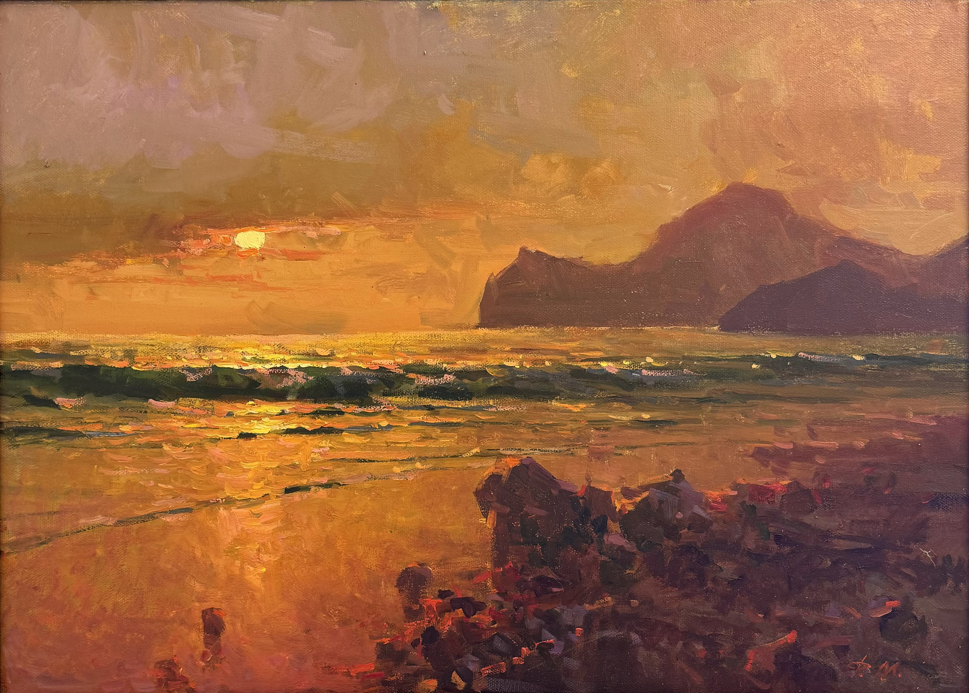 The painting depicts a magical seascape with a sunset that colors the sky and water in warm golden-orange hues. The sun is low on the horizon, its glow reflected on the waves, creating a play of light and shadow. The calm sea rolls in light waves onto the shore, which is strewn with stones. In the distance, dark silhouettes of majestic mountains are visible, creating a contrast with the bright sky. The painting conveys an atmosphere of peace and grandeur of nature, awakening a sense of harmony and infinity of the moment.