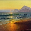 The painting depicts a mesmerizing seascape at sunset. Warm rays of the sun paint the sky in gentle shades of yellow and orange, reflecting in the water as a golden path. Calm waves gently roll onto the sandy shore, creating a peaceful atmosphere. Majestic mountains are visible in the distance, the silhouettes of which dissolve in the evening light, adding depth and perspective to the composition. The artist masterfully conveyed the play of light and shadow, creating the effect of a living, breathing space. This painting is filled with the warmth, harmony and romance of a seaside sunset.