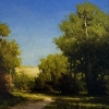 The painting depicts a sunny summer landscape. A narrow path leads deep into the scene, subduedly lost among the green trees. Soft light breaks through the dense foliage, creating a play of shadows on the grass. The bright blue sky gives the painting richness and space, harmonizing with the warm shades of green. In the background, hills are visible, slightly dissolving in the sun's haze. The painting conveys a sense of serenity and calm, inviting the viewer to immerse themselves in nature and enjoy its silence.