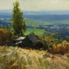 In the distance, endless expanses open up, where soft blue and green tones convey the depth of the aerial perspective. The sky dissolves in a light fog, adding atmosphere and tranquility to the painting. The picturesque manner of painting with expressive brushstrokes conveys the movement of light and a feeling of secluded harmony of nature.