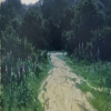 The painting depicts a forest road leading deep into the dense greenery. The light sandy path gently curves, dissolving into the dark shadow of the trees. Along the edges of the road grows lush grass with tall flowering plants, adding bright accents. The sky with heavy gray clouds hangs over the forest, creating the feeling of an approaching thunderstorm or a gloomy evening. The painting conveys an atmosphere of calm and mystery, evoking a feeling of solitude and slight melancholy. The artist masterfully uses light and shadow, conveying the depth of space and the play of natural colors.