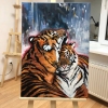 The painting depicts two tigers huddled together. One tiger laid its head on the other, creating a feeling of closeness and care. The background is designed in an abstract style using various shades of blue, gray and white, which adds depth and contrast to the image. The painting attracts attention due to the transfer of feelings of warmth and affection between animals, as well as the use of bright and saturated colors.