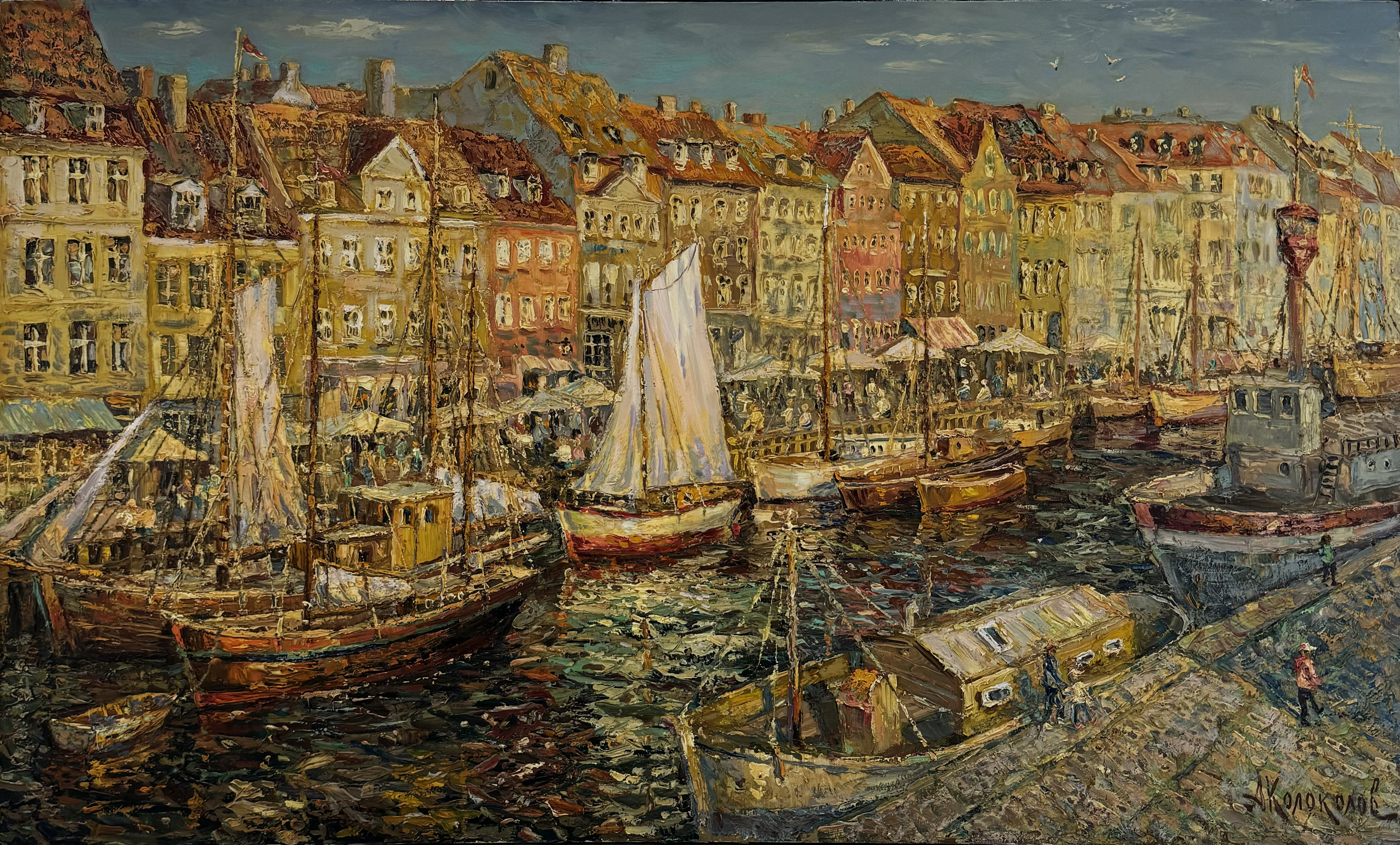 In his unique style, artist Kolokolov A. captured a moment in the life of an old harbor on canvas. This painting, “ Warm evening in Copenhagen,” is not just a realistic depiction of a city by the water; it is more of a poetic reflection on time, on the connection between man and the sea, on the quiet beauty of the everyday. Here, every brushstroke is filled with a love for detail and a deep understanding of the atmosphere of this place.