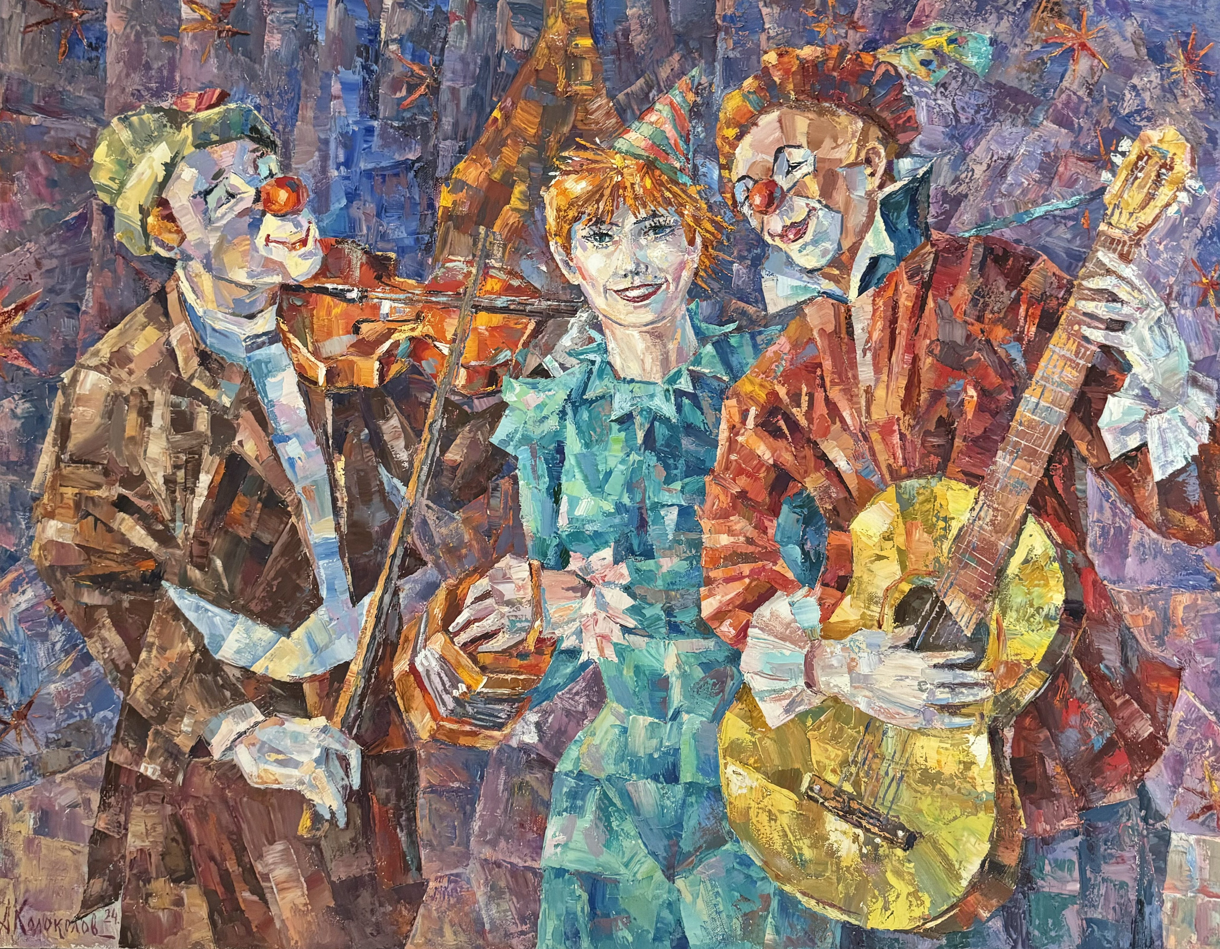 Kolokolov A. “ Merry melody” is not just a depiction of clowns; it is a reflection on the nature of art, on the role of the artist in society, and on the importance of bringing joy to people. This large painting, measuring 70x90 cm, can be hung on the wall to decorate the interior of an apartment, house, office, restaurant, or hotel.