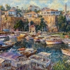 Behind the port, on a high cliff, is the old part of the city with dense development - white houses with red tiled roofs, many windows and balconies. The colorful city wall rises above the port, and behind it, among the greenery, you can see more houses and the spire of a minaret. The palette of the painting is warm and sunny, many light brushstrokes create a feeling of liveliness and a cheerful urban mood. The painting breathes a summer atmosphere, the freshness of a seaside city and the bustle of a sea harbor.