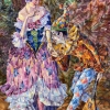 The background of the painting is quite abstract, consisting of energetic brushstrokes of green, burgundy and gold, emphasizing the dynamics and brightness of the scene. The atmosphere of the canvas is theatrical, perky and a little playful, as if the action is unfolding in a comedy of masks.