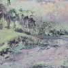 A poetic composition in which pastel shades of green, purple and turquoise flow, evoke associations with early morning or the moment after the rain, when the earth is filled with freshness. The blurred lines create a feeling of fog or reflection in water. The landscape is barely discernible, like a memory or a dream, and it seems that it is about to dissipate. This is an immersion in the melancholy of quiet nature, where the world is silent and listens to itself.