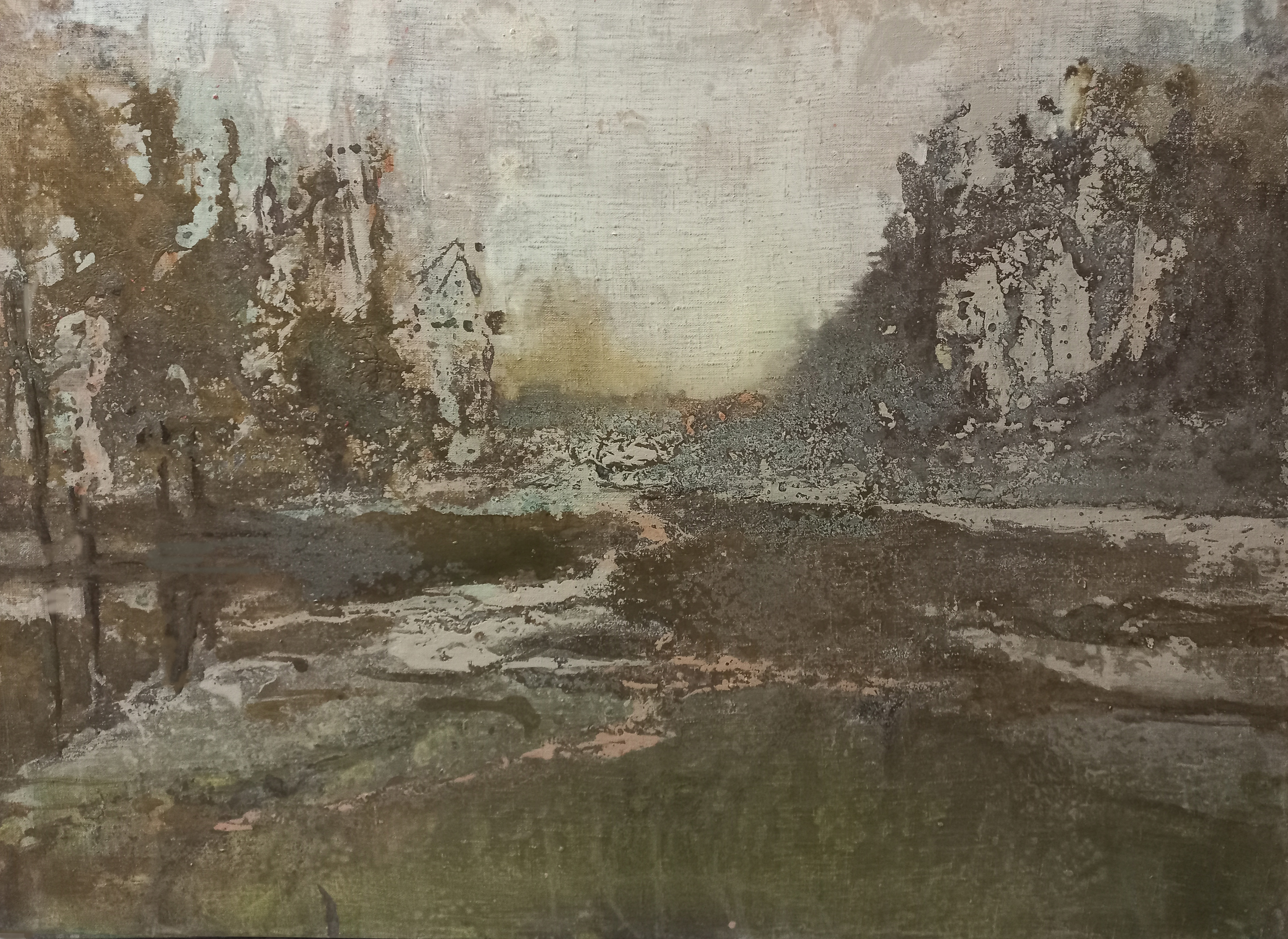 The motif of morning freshness and lightness can be traced in this work. Translucent strokes of faded green, brown and reddish-gray tones form the appearance of a park alley opening into the distance. The trees on both sides seem to be surrounded by a light haze, and somewhere in the distance the whitening sky can be seen. The textured surface resembles the imprints of time - the work of wind, rain, sun. The picture breathes peace and soft sadness.