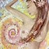 The painting depicts a half-naked woman with long, flowing hair decorated with flowers. Her pose is graceful, she smoothly raises her arms above her head, creating a feeling of relaxation and inner harmony. A slight tilt of the head and closed eyes add dreaminess and calm to the image.