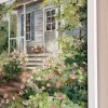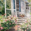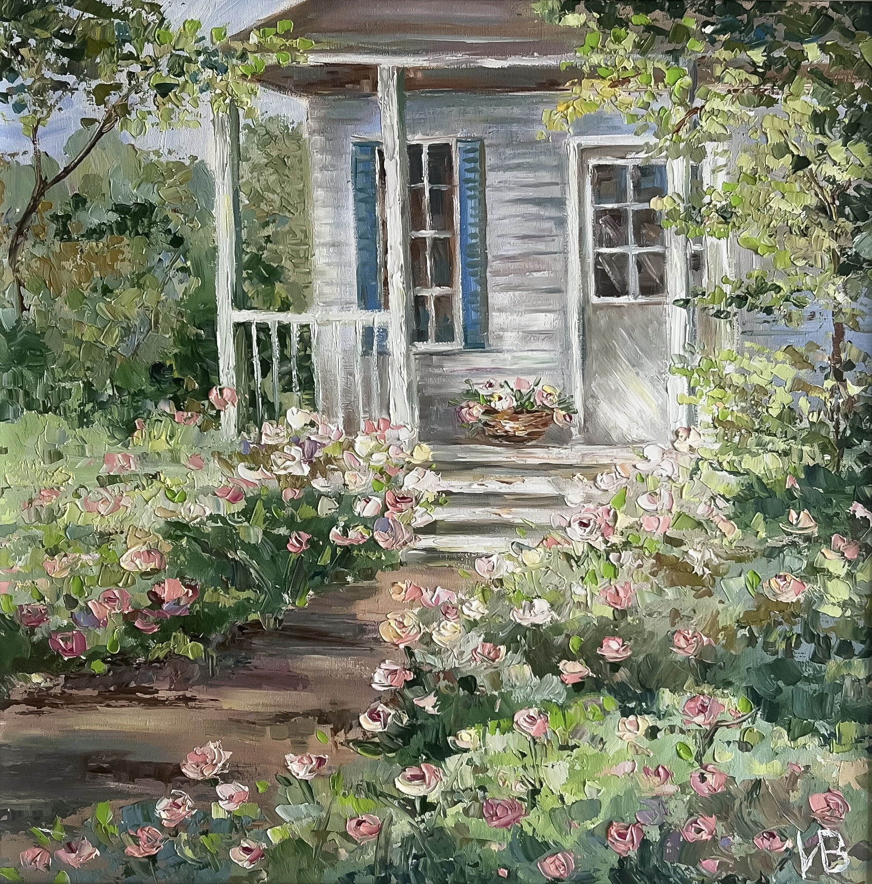 В центре композиции находится старый уютный дачный домик. Стены домика выкрашены в светлые, серые и белые тона, что создаёт ощущение выцветшего на солнце дерева. Четкий архитектурный элемент — дверь и окна — контрастирует с буйством окружающей растительности. Единственный яркий акцент на самом домике — голубые или синие жалюзи, добавляющие прохлады.