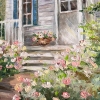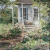 Домик окружен густой зеленью. Листва и ветви, обрамляющие веранду, выполнены в разнообразных сочных оттенках зеленого, что подчеркивает богатство и пышность летнего сада.