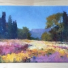 The painting depicts a picturesque summer landscape. Under a bright, clear blue sky, a blooming field spreads out, shimmering with shades of yellow, pink and purple. Soft brushstrokes convey the feeling of sunlight, which playfully falls on the grass and flowers. In the distance, the silhouettes of dense trees darken, creating a contrast with the open space of the field. Behind the trees, the contours of the mountains are visible, softly dissolving in a blue haze. The artist used a rich palette and impasto technique of brushstrokes, giving the painting dynamics and liveliness. The atmosphere is filled with warmth, silence and peace.