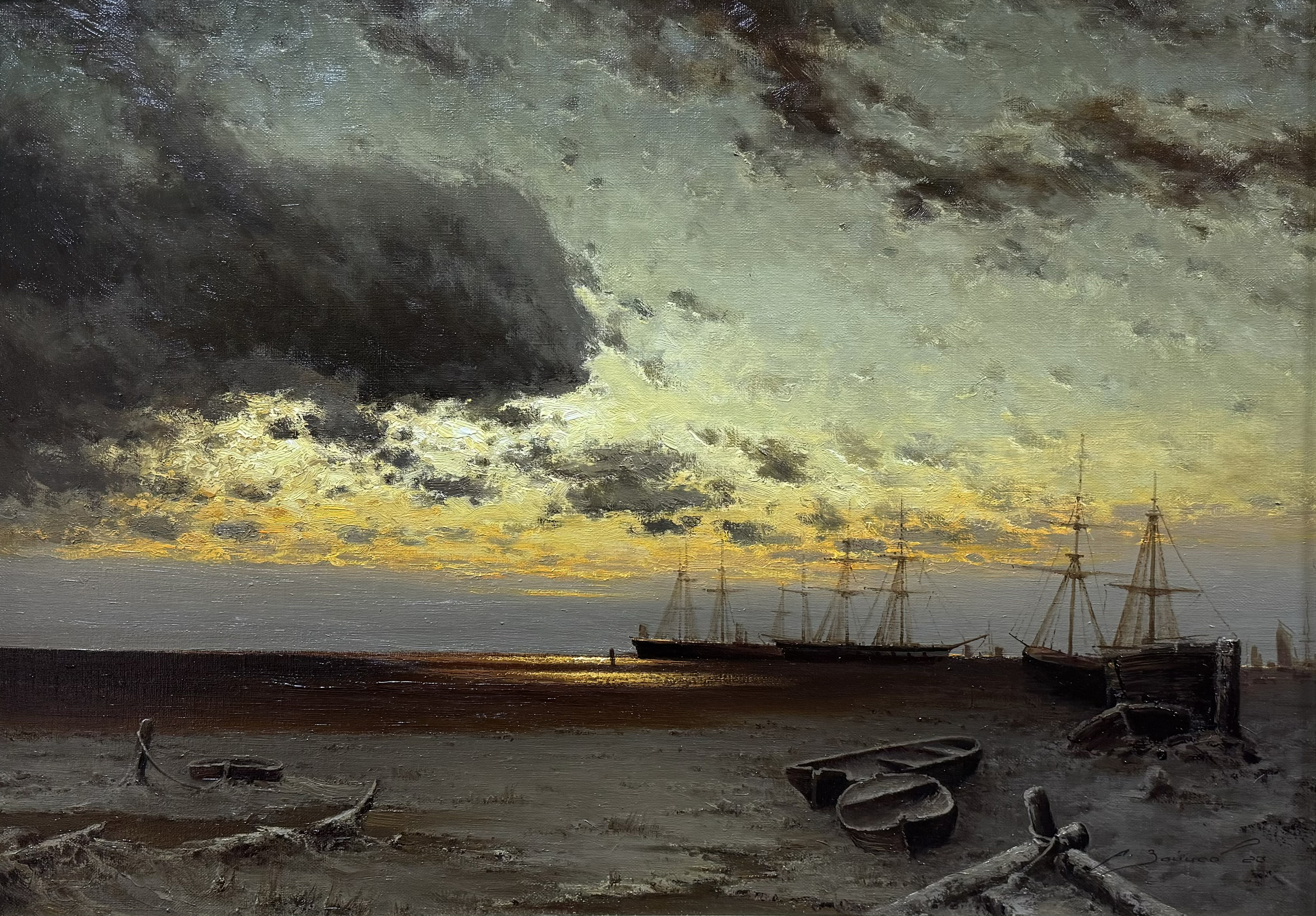 On the canvas, we see a wide strip of sandy shore on which lie the wreckage of boats and some objects. In the distance, the silhouettes of ships frozen in anticipation are visible. The sky is covered with dark storm clouds, through which the last rays of the setting sun break through, creating a dramatic contrast. The figure of a lone man on the shore adds scale to the composition and emphasizes the feeling of loneliness and alienation.