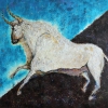 «Небесный бык» — это дань уважения мифологии. Картина Чепкасовой передает ощущение первобытной силы и движения, заключенное в статичном текстурированном образе, где животное выступает как вечный символ, бегущий по границе между светом и тьмой.