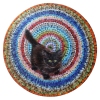 The composition is built on a strong visual contrast between the central figure and the background. In the center, right on the rug, is a small fluffy black kitten («Черныш»). The animal’s fur is painted with dense, fine strokes that convey its soft texture. The kitten’s bright yellow-green eyes look directly at the viewer, giving the portrait liveliness and mischief.