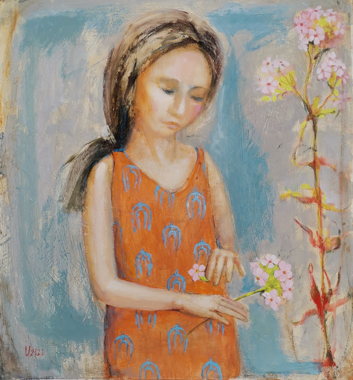 The painting is done in soft pastel tones with a muted blue and beige background. In the center of the composition is a girl in a simple orange dress with a blue print. Her gaze is lowered, the movements of her hands are careful and thoughtful - she sorts through small pink flowers in her hands, as if thinking about something important or sad.