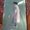 The painting is filled with restrained lyricism and subtle expressiveness. It depicts a woman in a light coat and a black hat, standing in profile in front of a muted green background. The artist uses a rough, textured painting technique - the brushstrokes are noticeable, as if deliberately careless, which adds a special depth and atmosphere of time to the work.