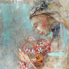 A bowed figure of a young girl, whose head is lowered, and her face is illuminated by an inner light. In the foreground is a lush bouquet of flowers, made decoratively: white flowers are enclosed in bright red circles, which gives the work a special decorativeness and a modern sound. The background is textured, with turquoise and ochre shades dominating. The whole image is filled with calm, solitude and tenderness. It feels both modern and has echoes of folk art.