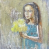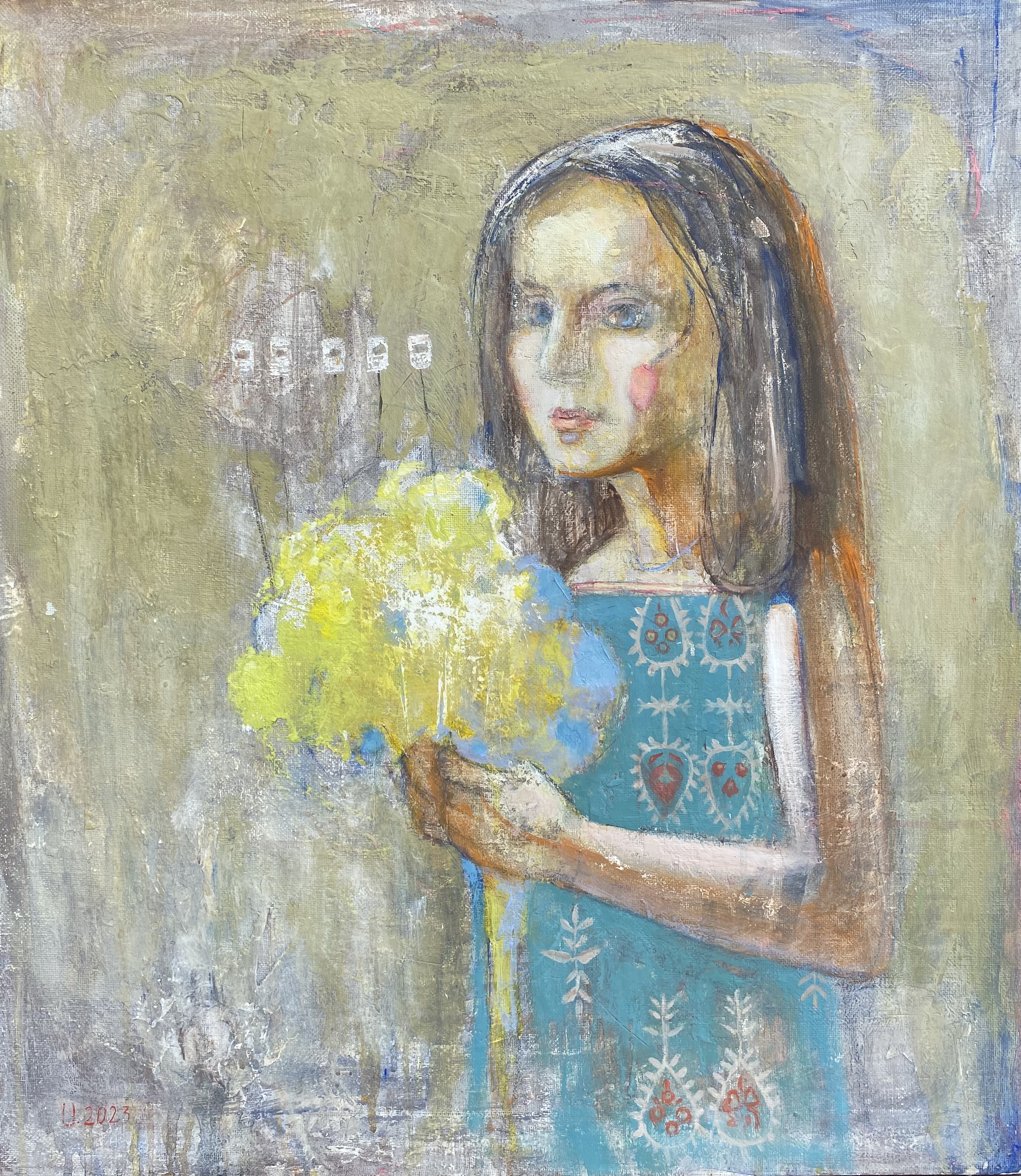In this picture, a girl with long dark hair and rosy cheeks stands in profile. She is wearing a turquoise-blue dress with a complex folk pattern, and in her hands she holds a lush bouquet of yellow flowers - perhaps mimosa. Her face is thoughtful, her gaze is directed to the side. The atmosphere is dreamy and a little sad, the composition feels like a combination of folk traditions and the individual world of a child.