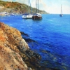 On the canvas, we see a quiet harbor surrounded by hills. Sailboats sway in the calm water of the harbor. In the distance, a shore with white houses and green trees is visible. In the foreground is a rocky shore with stones washed by the azure sea. The sky is blue, with light clouds reflected in the calm surface of the water. The whole painting is filled with a sense of silence and tranquility, creating an atmosphere of relaxation and peace.