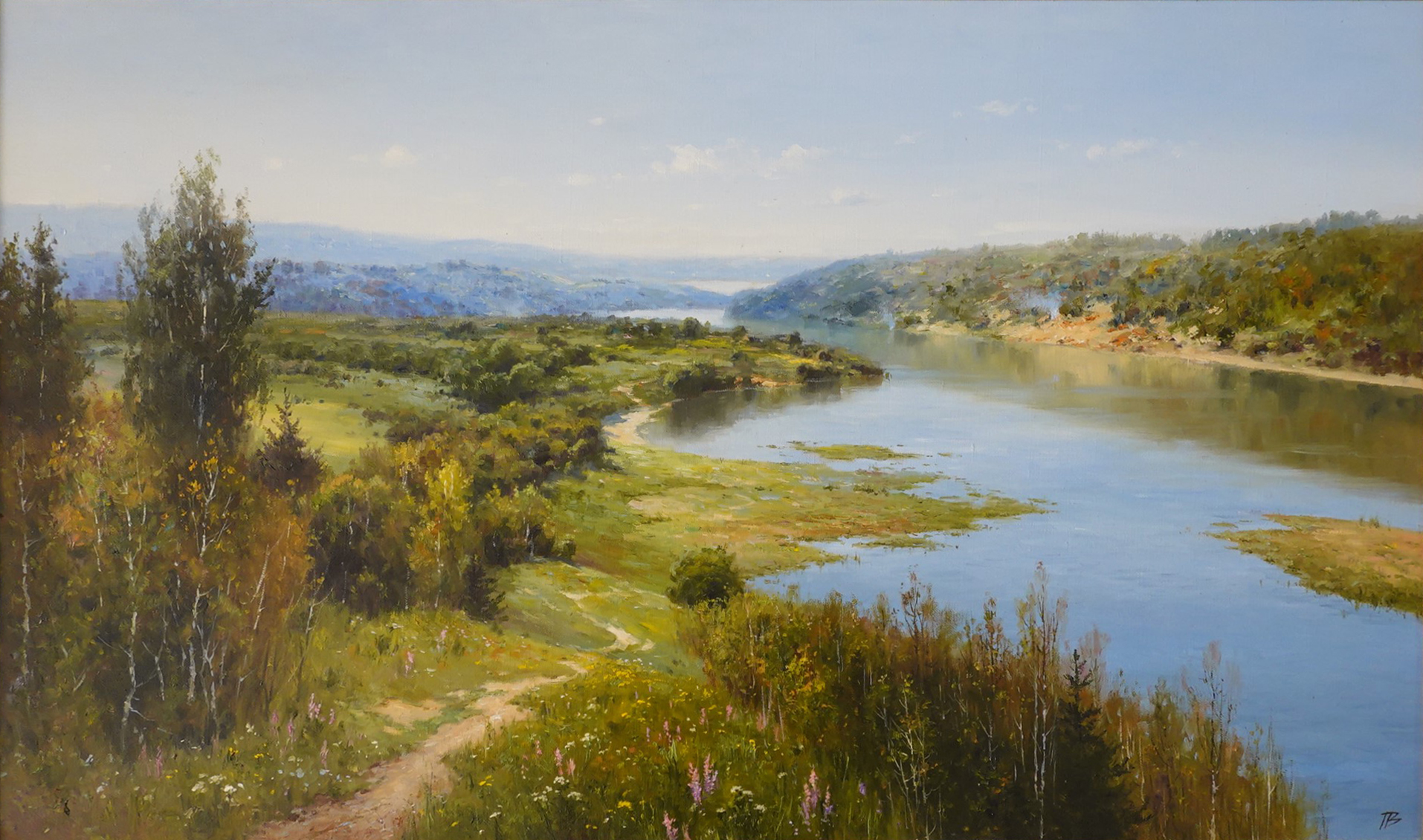 On the canvas, we see a wide river smoothly carrying its waters into the distance. The riverbanks are gentle, overgrown with lush grass, flowers, and bushes. A light sandy path invites you to stroll along the bank and enjoy the peace and quiet. In the distance, a view opens up to a hilly area covered with forests and woodlands, shrouded in a light haze. The blue sky with sparse clouds is reflected in the calm surface of the river, creating a sense of spaciousness and boundlessness.