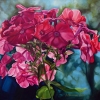In the foreground is a large bouquet of phloxes, executed in a realistic manner. Bright shades of crimson and pink with various transitions on the petals create a feeling of living volume. The background is soft, blurred, imitating the summer atmosphere of the garden, where the light breaks through the green leaves. The work is filled with a mood of coziness and freshness, emphasized by the morning light.