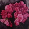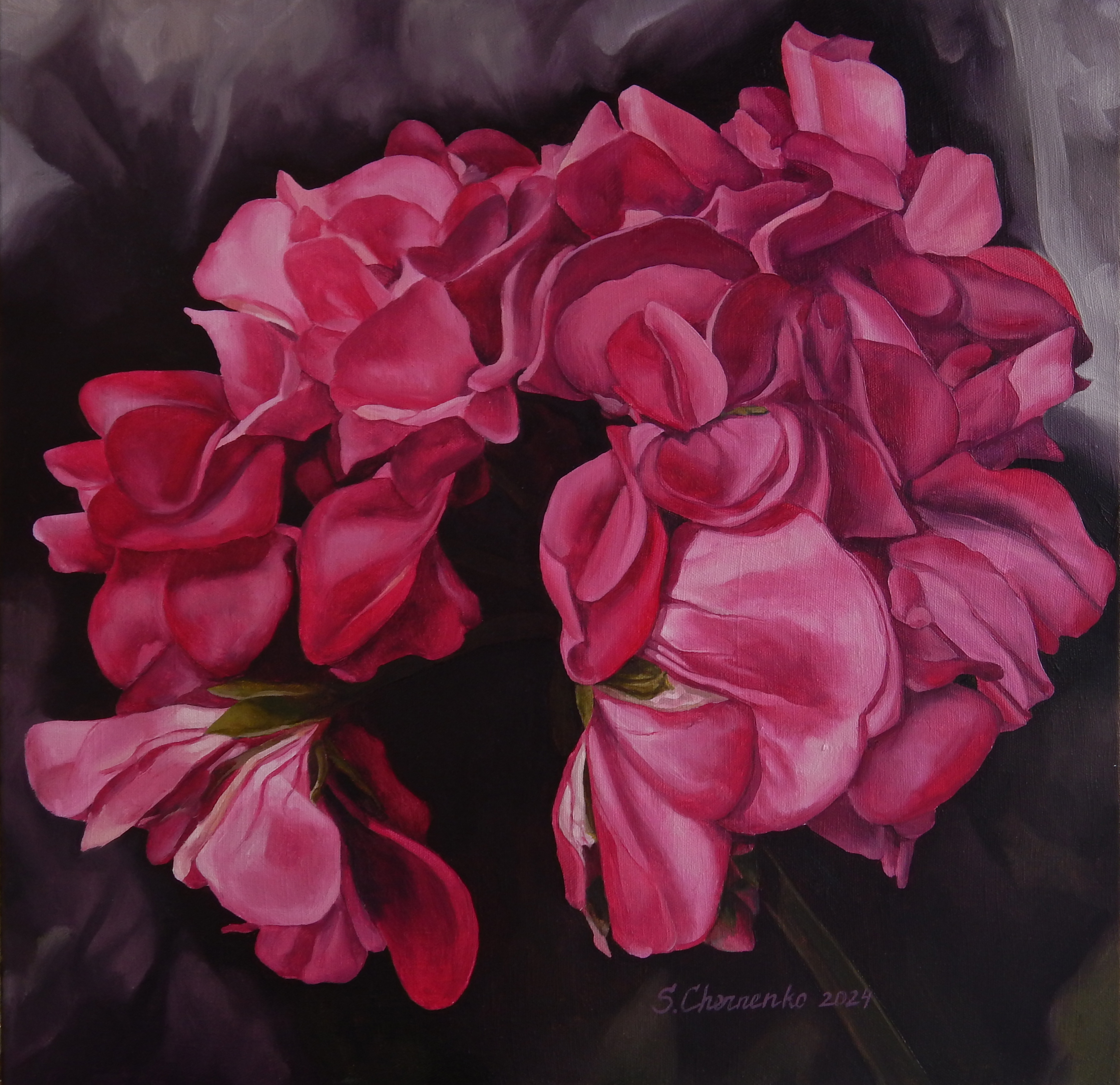 The main character of this work is a lush inflorescence of geranium of a rich pink color, painted with special attention to detail. The petals are conveyed with dense, rich strokes, which gives the flower the effect of volume and velvetiness. The dark blurred background allows you to concentrate your gaze only on the main object - the flower, emphasizing its beauty. The picture radiates coziness, harmony and warmth of home space.