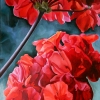 The canvas features two large-scale depictions of scarlet inflorescences against a background of muted greenery. The petals are multi-layered, conveyed in different transitions from rich scarlet to deep red with iridescent shadows. The diagonal lines of the stems add dynamics to the composition, and the richness of the colors creates a festive mood and a feeling of summer sun. The work is expressive in color and composition, it feels like the energy of a living flower.