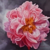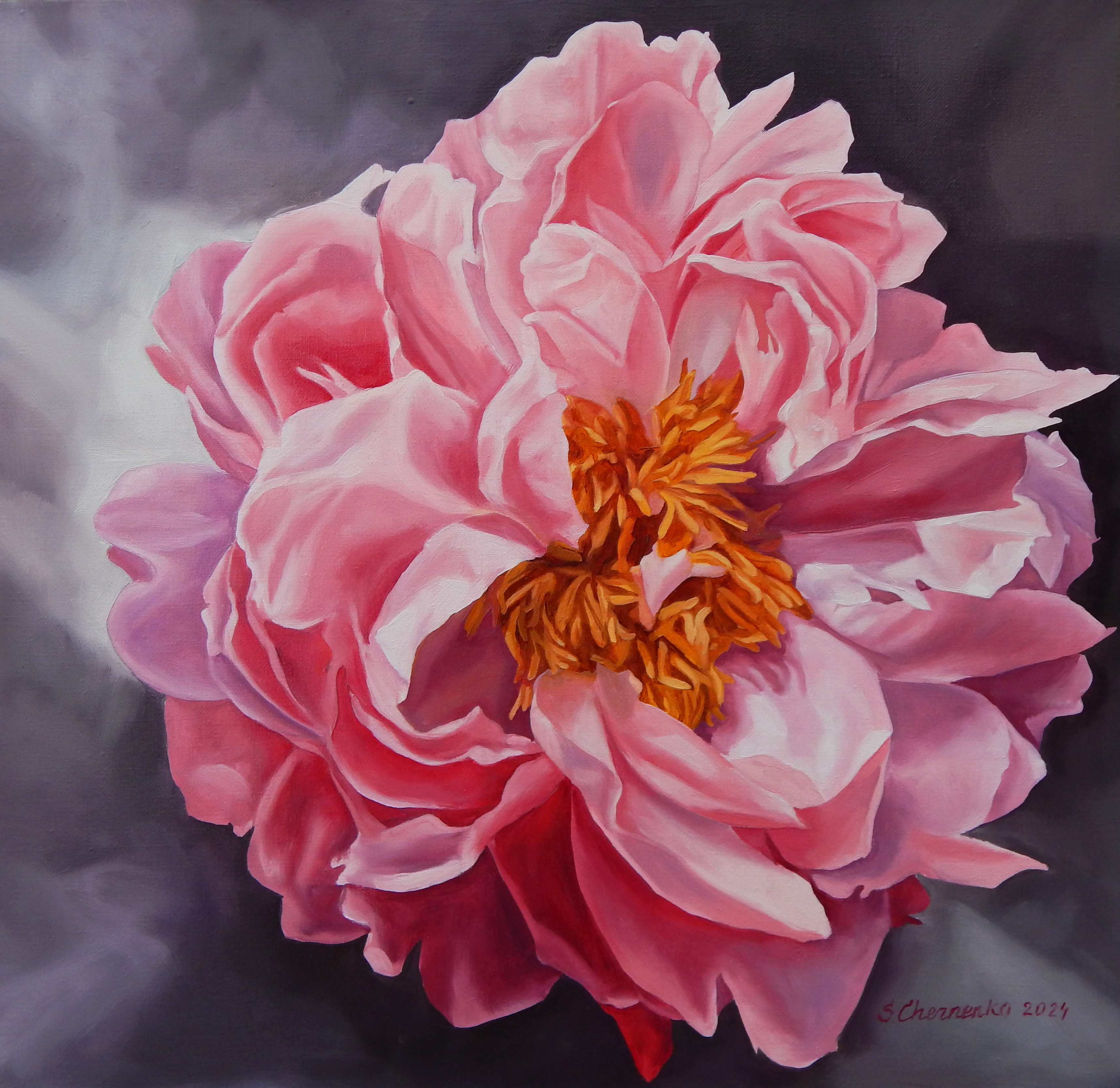 The center of the painting is an open peony with luxurious velvet petals and golden stamens in the center. The artist carefully drew the structure and subtle nuances of the petals, conveying their tenderness. The neutral dark background emphasizes and highlights the flower, creating the illusion of lightness and depth. The painting expresses the beauty of fleeting flowering and symbolizes the harmony of nature.