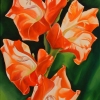 In front of the viewer is a luxurious branch of gladioli in sunny scarlet and orange shades. They stand out against the background of dark green vegetation due to the contrast and saturation of the color. Thanks to the detailed drawing, fragile veins and play of light on the petals are visible. The painting is filled with energy and cheerfulness, symbolizing summer abundance.