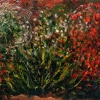 The composition is divided into color zones. On the left, deep greens and whitish-pink tones dominate, depicting foliage and small wildflowers. On the right, fiery red prevails, as if poppies or other bright summer flowers have blossomed there. The interaction of these contrasting color spots conveys the dynamics of growth and vital energy.