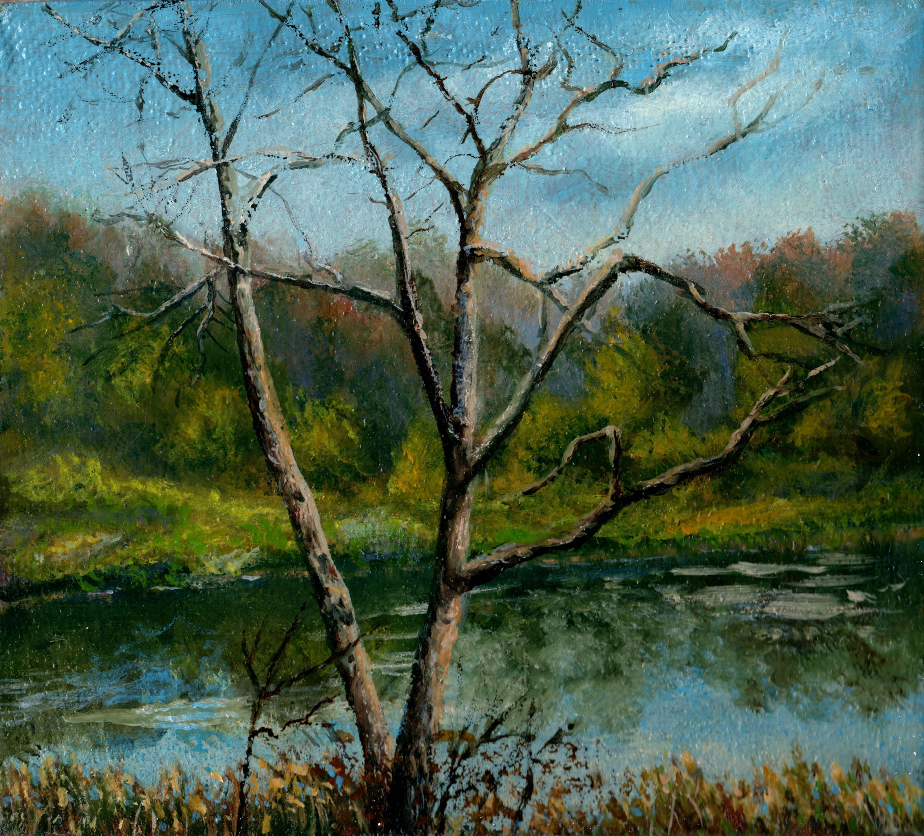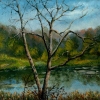 Behind the trees stretches a body of water, likely a river or pond, reflecting the sky and the shoreline vegetation. The water is painted with strokes of blue-green, creating a sense of coolness and movement.