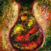 The background around the central figure dissolves into chaotic yet harmonious whirlwinds. On the sides, light, almost golden spots are visible, like wings or a radiance emanating from the vessel, giving the object a sacred, almost angelic halo. Green and brown shades combined with bright splashes create the impression of fertile yet wild nature, which is the source of all existence.