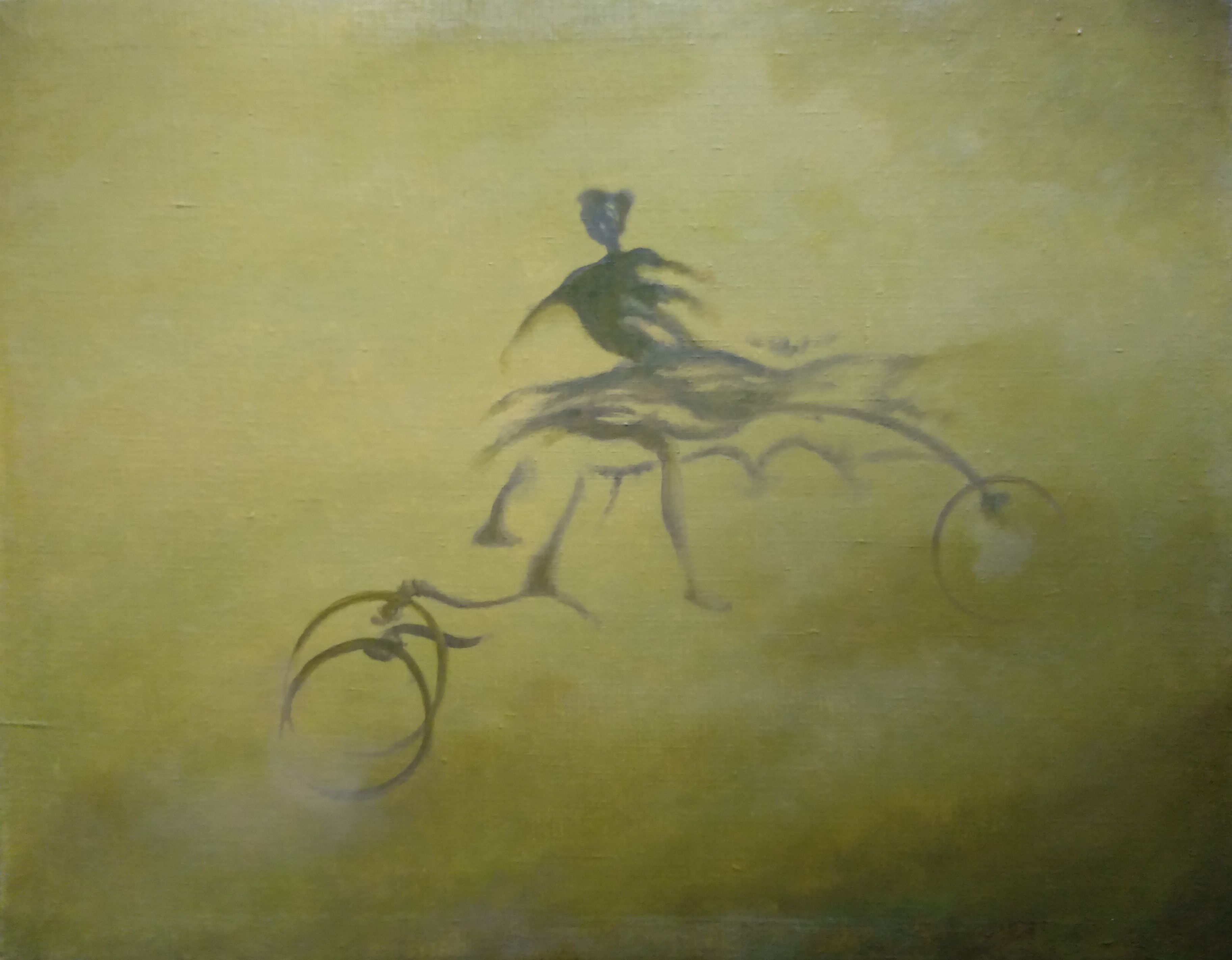 Картина Владимира Абаимова «Женщина-велосипедистка» — загадочное минималистичное полотно, балансирующее на грани сна и реальности. Художник использует приглушенную монохромную палитру, в которой преобладают желтовато-зеленые и охристые тона, создавая ощущение тумана или эфирной дымки, сквозь которую движется фигура.
