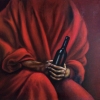 Vladimir Abaimov’s painting «The Hands with a Bottle» is a powerful and dramatic still life that deeply explores themes of isolation, despair, and addiction. The entire composition is bathed in a deep, unsettling red color that engulfs the figure, leaving only the hands and the bottle visible.