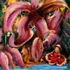 The contrast between the enormous textured flower and the fragile doll figure emphasizes the theme of loss and loneliness. Bright, expressive brushstrokes dominating the depiction of the flower are juxtaposed with carefully detailed features of the doll’s face, creating an effect of psychological tension.