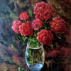 The lush velvety rosebuds are painted in deep, rich shades of carmine and burgundy. Their fiery color contrasts with the dark, almost gothic background, creating an effect of inner glow. Abaimov masterfully conveys the transparency of the glass vase, through which the stems refract the light. This still life is not just a depiction of flowers; it is an allegory of resilience and stubborn beauty that does not surrender to the inevitability of fading. The work is imbued with nostalgia and admiration for the last, brightest gift of autumn.