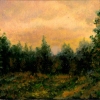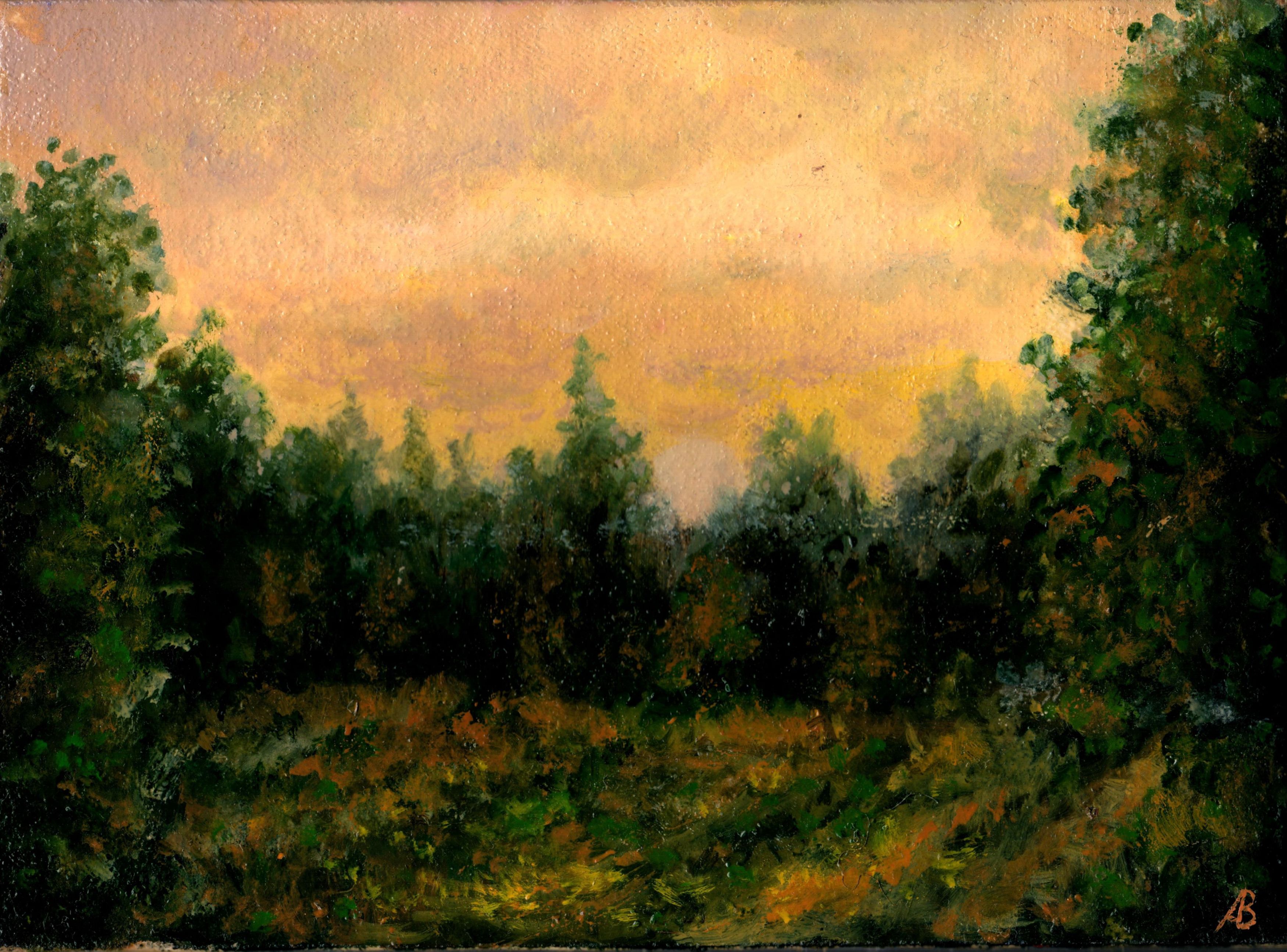 Vladimir Abaimov's painting «Облачно» is an intimate landscape capturing the state of nature during a leisurely evening fading. The artist masterfully captures the changeable character of the sky: soft, peachy-golden tones of the clouds create a cozy glow that seems to spread over the dark strip of forest.