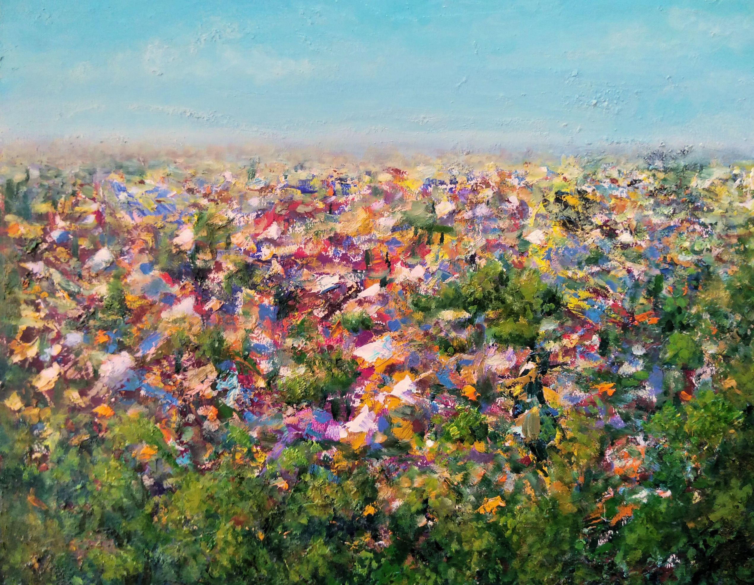 The palette of the canvas is filled with rich shades: pink, yellow, azure, and emerald spots merge into a single fabric of life. We almost feel the hot air, infused with the scents of flowers and the sea breeze. Despite the abundance of details, the painting maintains an amazing unity, allowing the viewer’s eye to freely wander through this colorful, joyful space. «Южный город» is not just a depiction of a place, but a state of festive, carefree happiness that Abaimov masterfully transfers onto the canvas, capturing the fleeting charm of southern warmth.