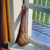 The painting depicts a domestic still life, where a broom leaning against the wall becomes the central element. The golden-brown fibers of the broom contrast with the bright yellow drapery of the curtain on the left. Sunlight streaming through the window creates sharp geometric shadows on the light wall and the blue tiled floor of the balcony. Outside the window, lush green trees are visible, adding depth and freshness to the composition. The work is distinguished by attention to detail and masterful use of light and shadow, emphasizing textures and forms.