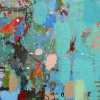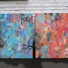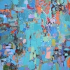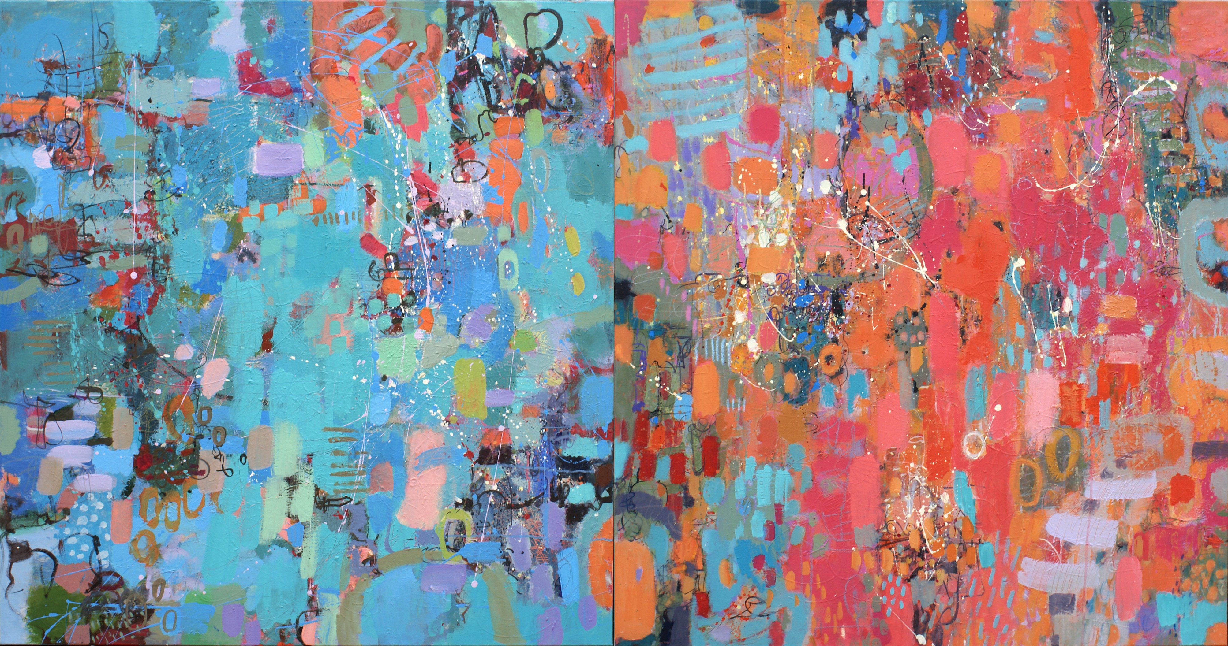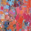 This is a composition divided into two parts: the left is filled with various shades of blue, blue, turquoise and purple; The right one is an explosion of coral and pink flowers with yellow, orange and white. The lines, circles and spots seem to continue into each other and create a sense of a play of flying luminous particles. The work is charged with the energy of movement and optimism, connecting two worlds - the calm of water and the heat of the earth.